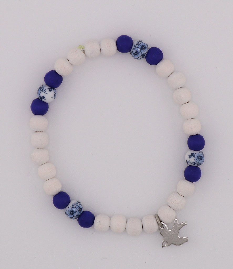 Bracelet élastique composé de perles de bois avec accents de perles de pierres, de pierres volacniques et/ou de céramique avec breloque en acier inoxydable. Convient aux poignets moyens. Confectionné avec soin par des artisanes innues de Mashteuiatsh.