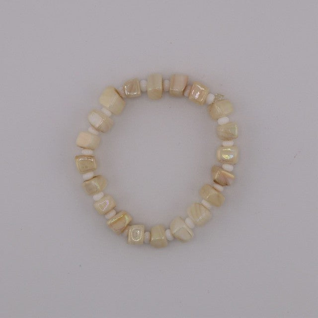 Bracelet élastique fait avec des perles de coquillage et des perles de verre. Convient aux petits poignets. Confectionnés avec soin par des artisanes innues de Mashteuiatsh