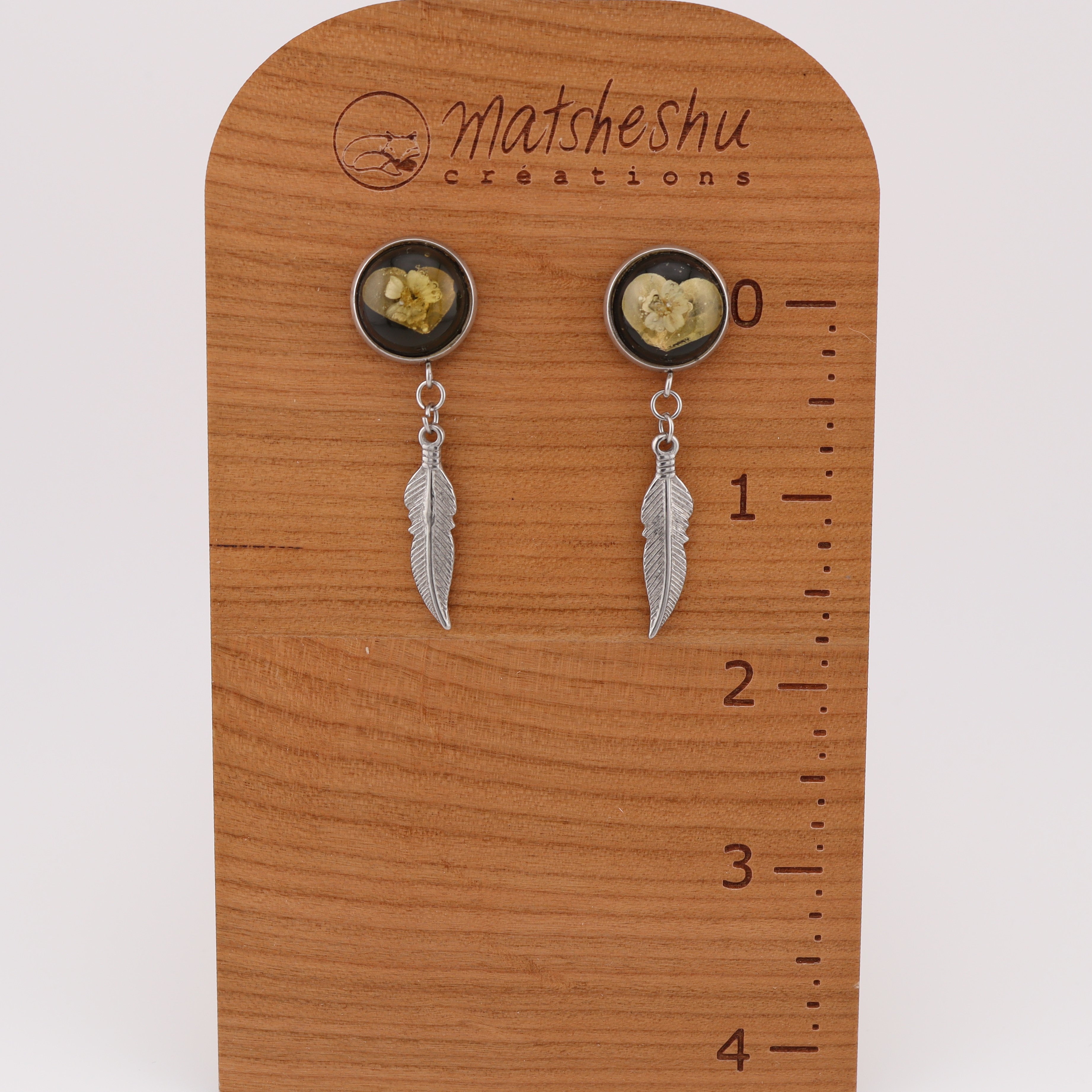 Boucles d'oreilles en acier inoxydable avec accent de vraies plantes emprisonnées dans la résine. Confectionnées avec soin par Nataly Kurtness, Innue de Mashteuiatsh.