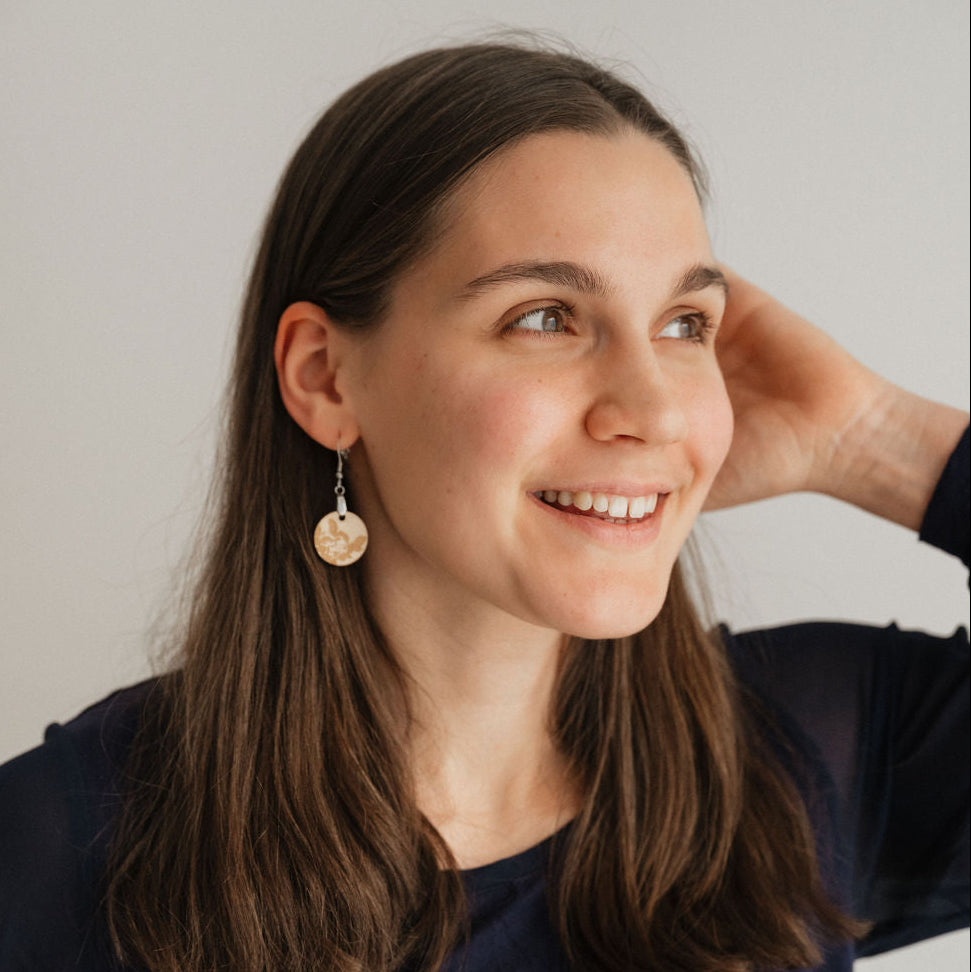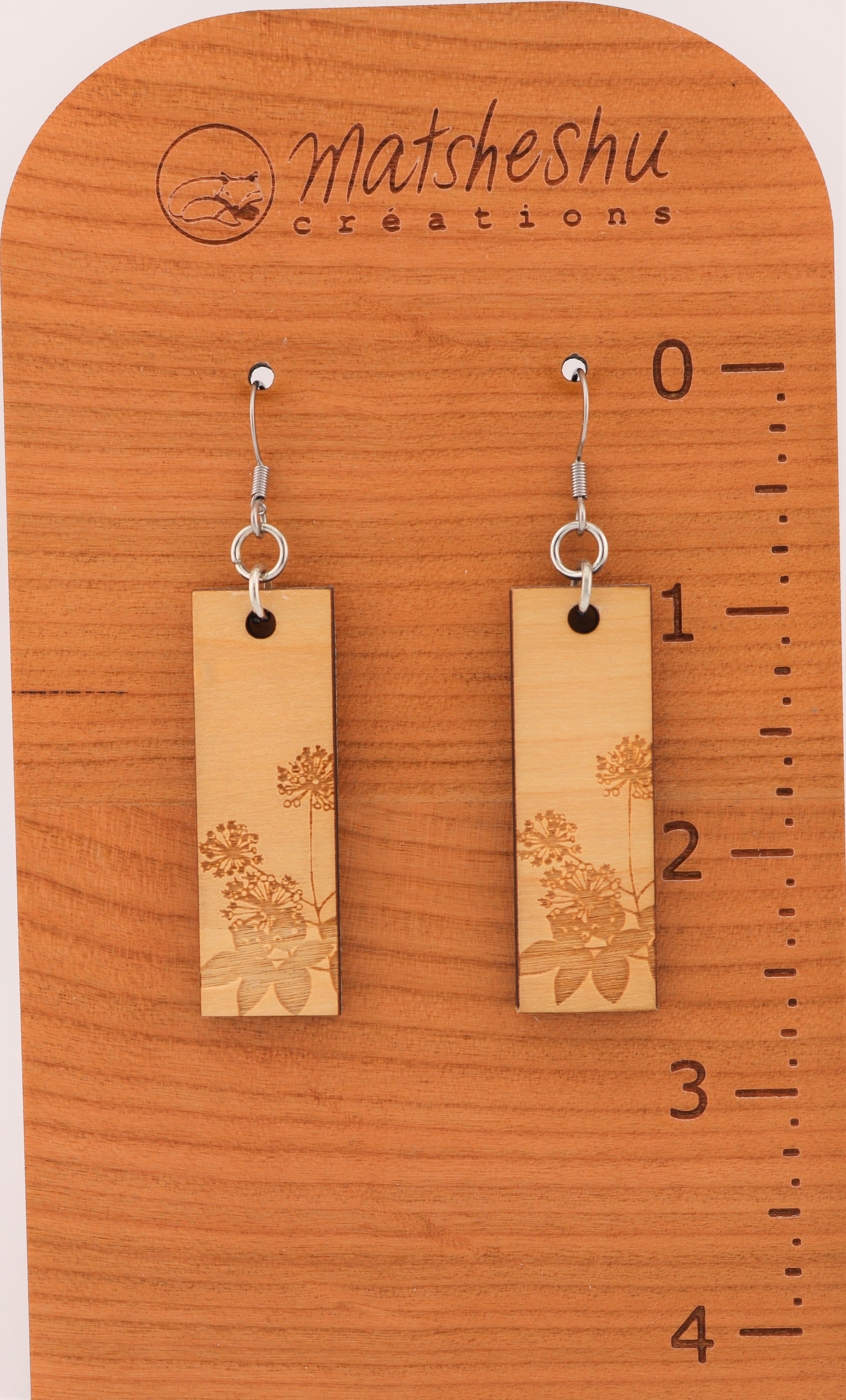 Boucles d'oreilles en bois légères mettant en valeur des plantes du Nitassinan (territoire traditionnel). Les plantes ont été dessinées par Raphaëlle Langevin, Innue de Mashteuiatsh, puis gravées au laser. Les attaches sont en acier inoxydable. l'essence de bois est l'érable.