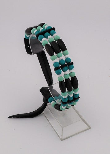 Bracelet artisanal unisexe fabriqué à la main avec perles de bois, perles en corne et lanières de cuir. Modèle composé de rangées de perles montrées sur du cuir naturel inspiré des pare-flèches traditionnels. Ajustable convient pour les poignets moyen à grand.