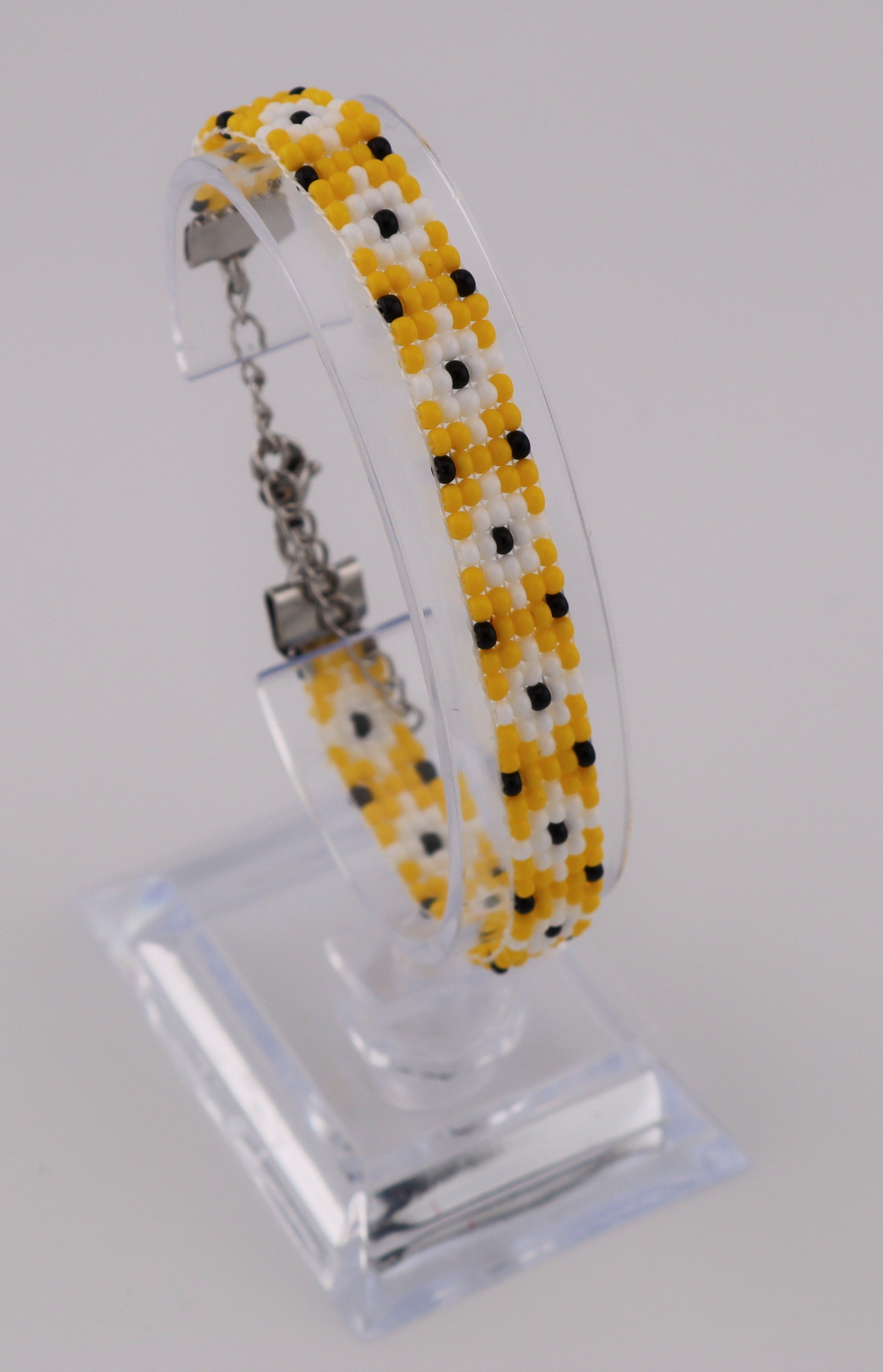 Bracelet en perles de verre tissé sur métier à perler. Modèle léger avec attache métallique ajustable. Idéal pour les poignets petit à moyen