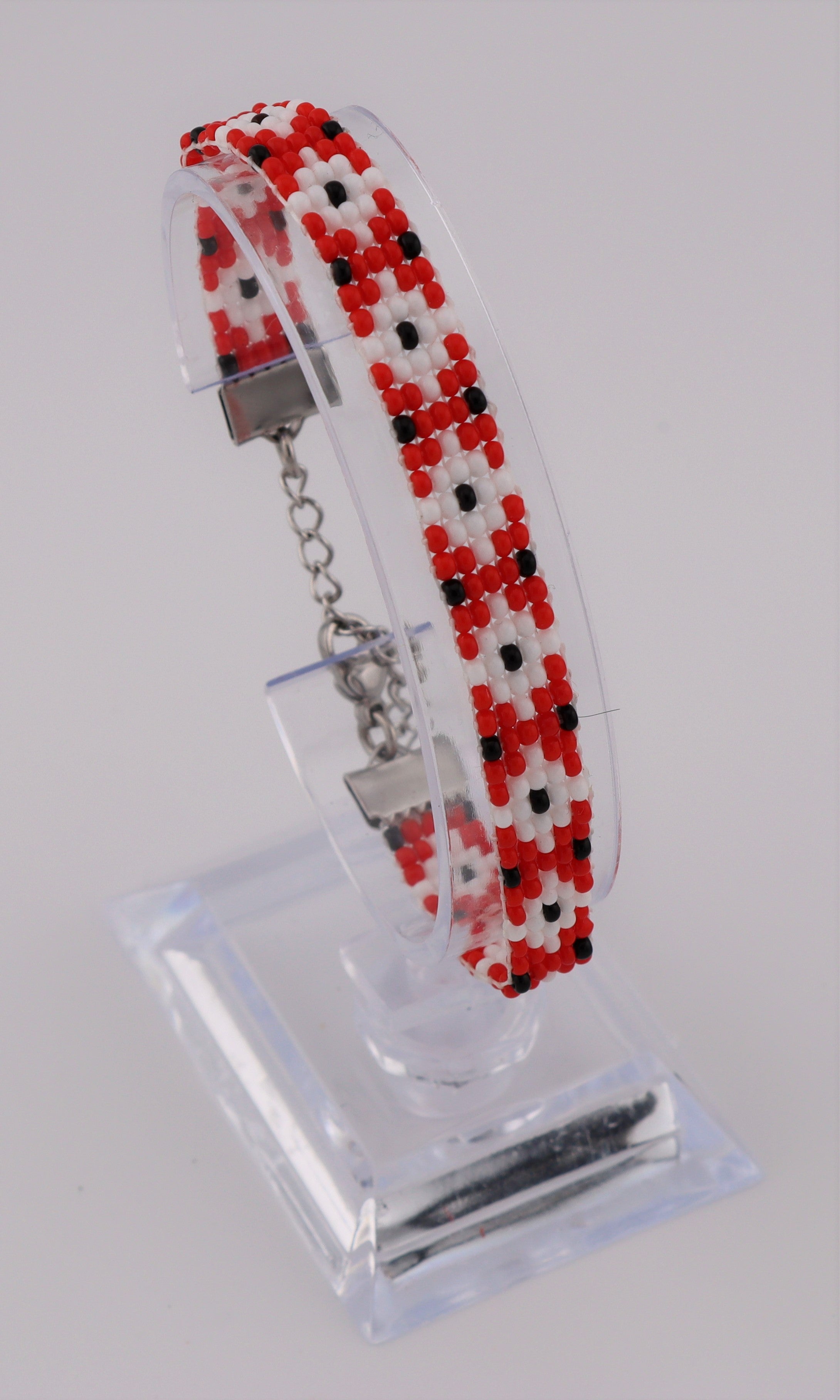 Bracelet en perles de verre tissé sur métier à perler. Modèle léger avec attache métallique ajustable. Idéal pour les poignets petit à moyen