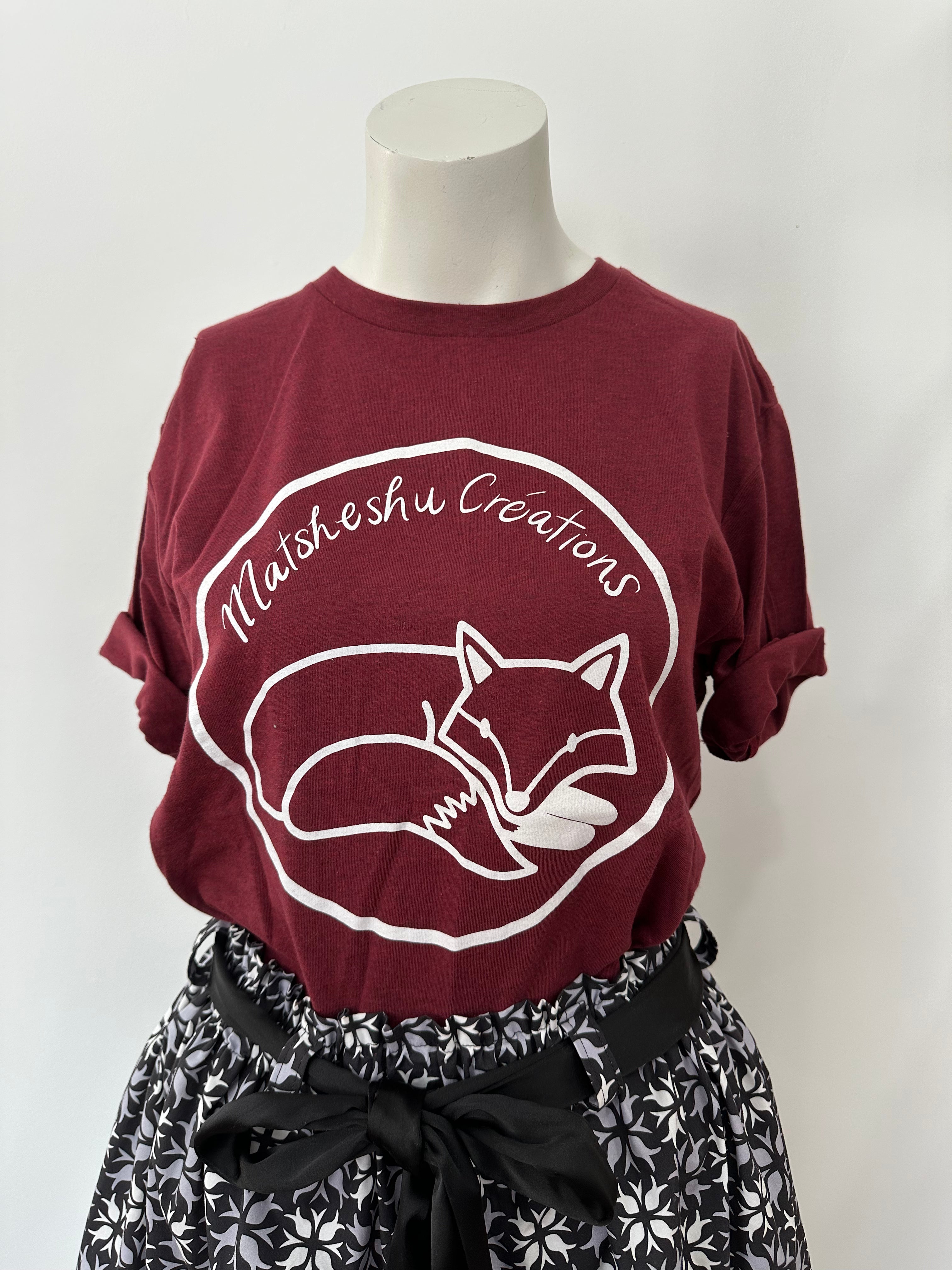 Chandail Matsheshu (renard). Sérigraphie sur tshirt 60% coton, 40% polyester. Disponible en taille unisexe (fait grand). Dessiné par Raphaëlle Langevin, artiste innue de Mashteuiatsh.