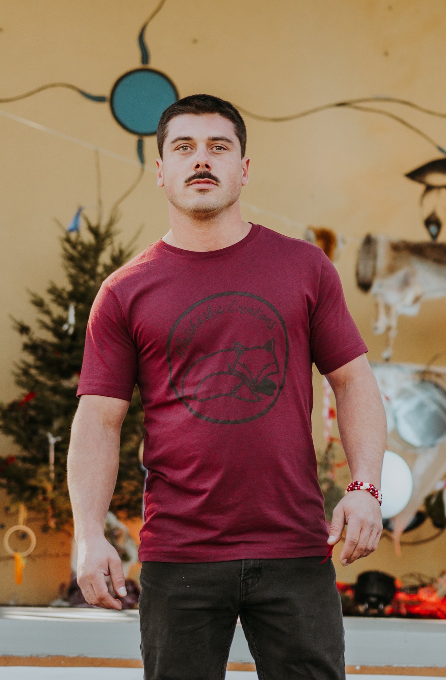 Chandail Matsheshu (renard). Sérigraphie sur tshirt 60% coton, 40% polyester. Disponible en taille unisexe (fait grand). Dessiné par Raphaëlle Langevin, artiste innue de Mashteuiatsh.