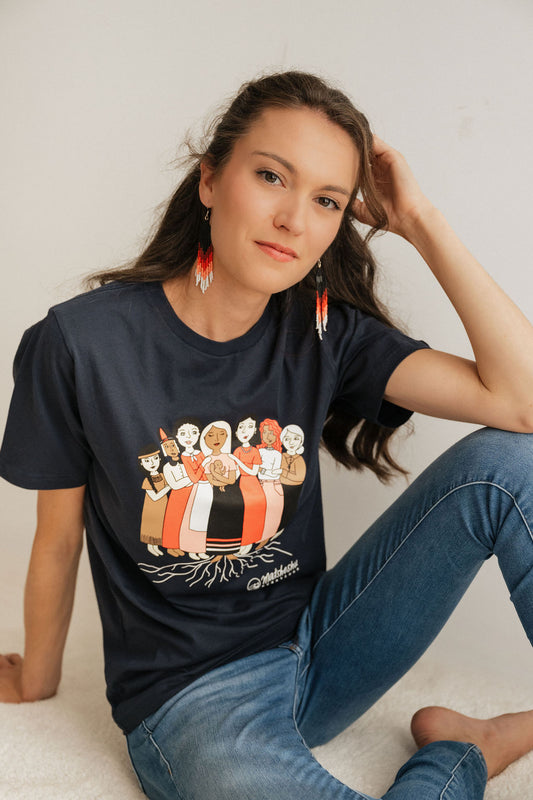 Ce t-shirt rend hommage aux femmes autochtones disparues et assassinées : des silhouettes solidaires, main dans la main, élèvent une plume comme un appel à la justice et à la mémoire. Un design créé pour se rappeler, soutenir et se tenir ensemble pour protéger nos femmes et nos filles. Sérigraphie sur tshirt 100% coton. Disponible en taille unisexe. Dessiné par Raphaëlle Langevin, artiste innue de Mashteuiatsh.