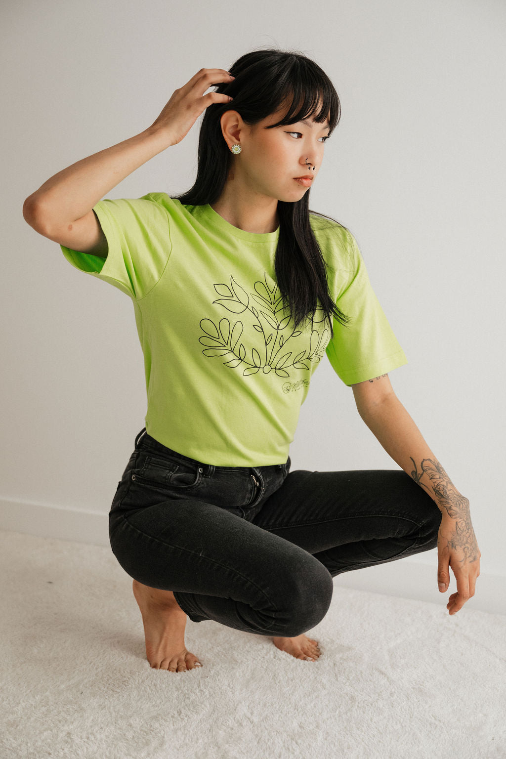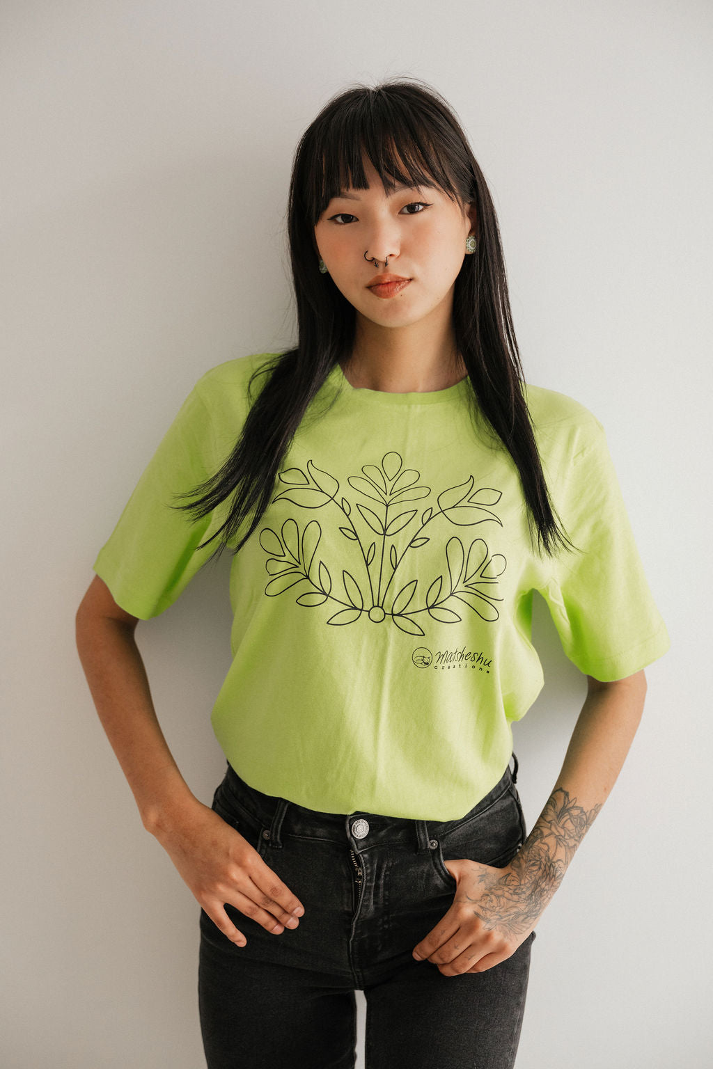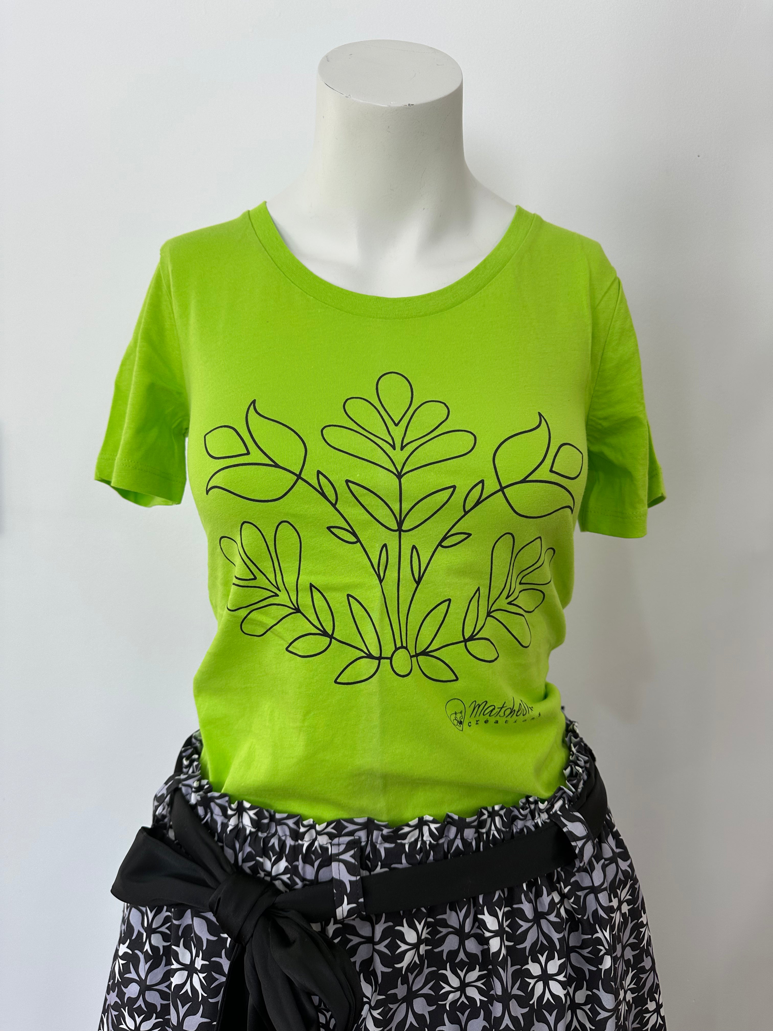 Chandail Uapikun (fleur). Sérigraphie sur tshirt 100% coton. Disponible en taille unisexe (fait grand) et taille femme (fait petit). Dessiné par Raphaëlle Langevin, artiste innue de Mashteuiatsh.