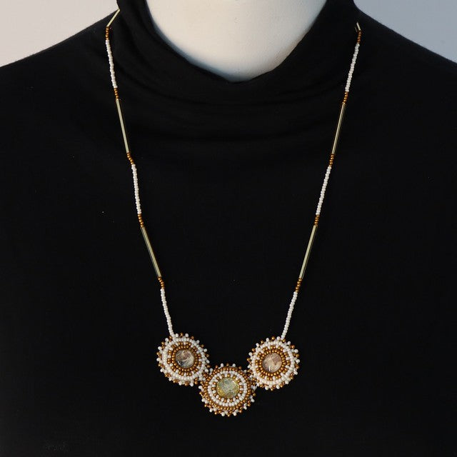 Collier de perles mettant en valeur trois cabochons perlés. Confectionné avec soin par Raphaëlle Langevin et Nataly Kurtness