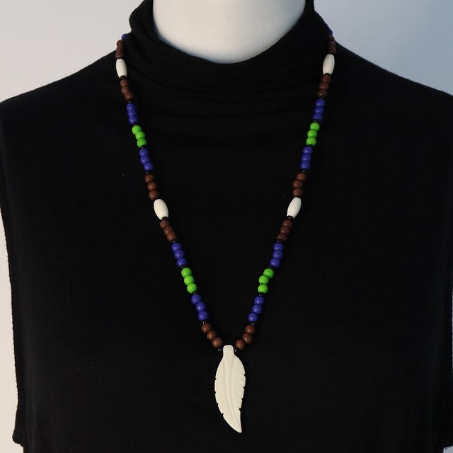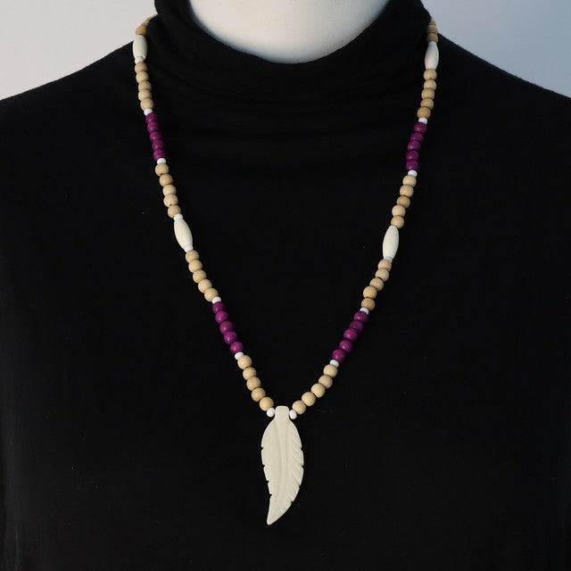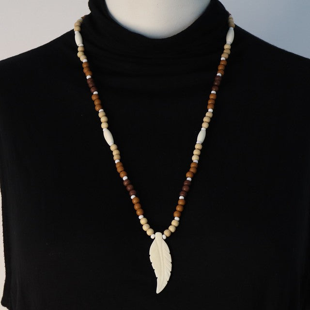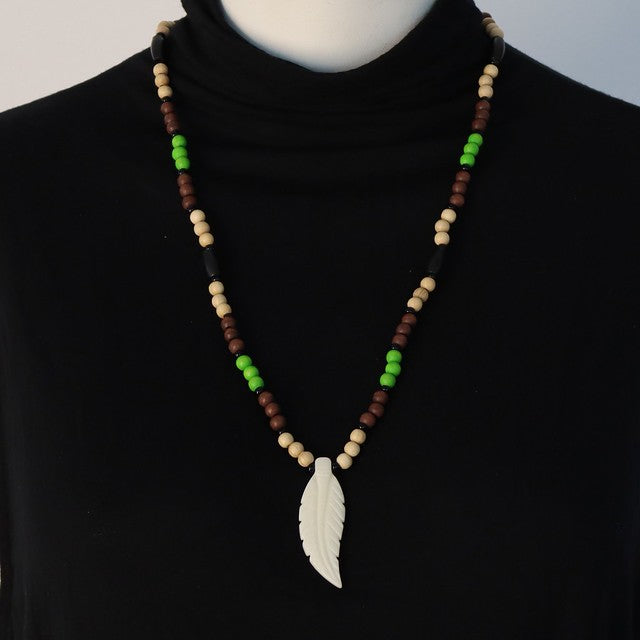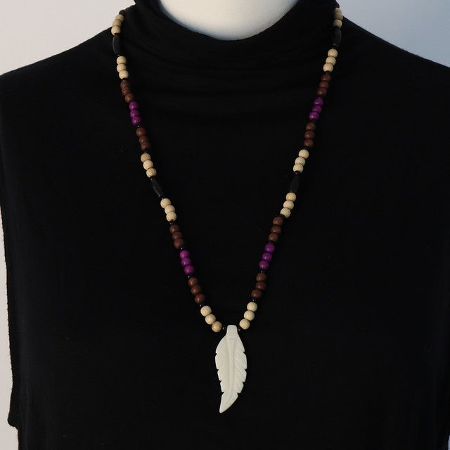 Collier en perles de bois avec accents de perles de verre et perles d'os avec pendentif d'os sculpté en forme de plume. Confectionné avec soin par des artisans innus de Mashteuiatsh.