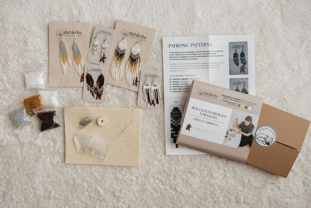 Crée cinq paires de boucles d’oreilles à franges grâce à un kit inspiré du savoir-faire des artisanes des Premières Nations. Matériel, instructions et vidéos inclus. Cette boîte créative te permet d’apprendre toutes les techniques de base pour créer des boucles d’oreilles à franges. Tu y trouveras tout le matériel nécessaire, des instructions détaillées et l’accès à une série de tutoriels vidéo pour t’accompagner pas à pas. Cette boîte est de niveau intermédiaire. C’est un projet accessible, mais qui demande une certaine dextérité et minutie.