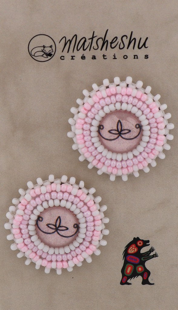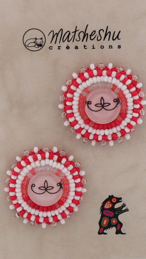 Grandes boucles d'oreilles avec un cabochon central de 12mm en verre entouré de quatre rangées de perles. Le motif au centre du cabochon a été dessiné par Raphaëlle Langevin. Modèle léger conçu pour un port confortable. Tige en acier inoxydable. Confectionnées avec soin par Shayna Raphaël-Dominique, innue de Mashteuiatsh.