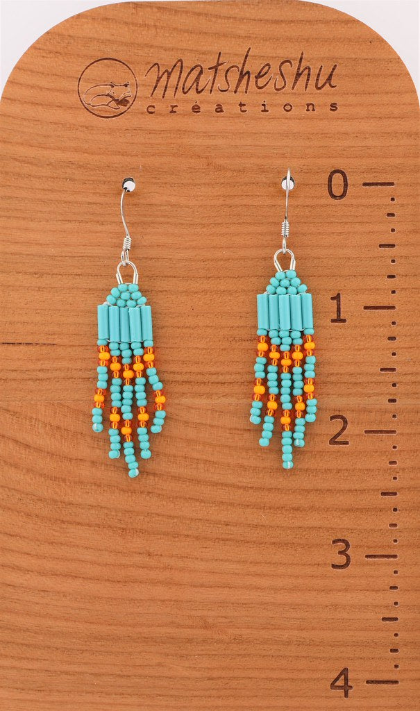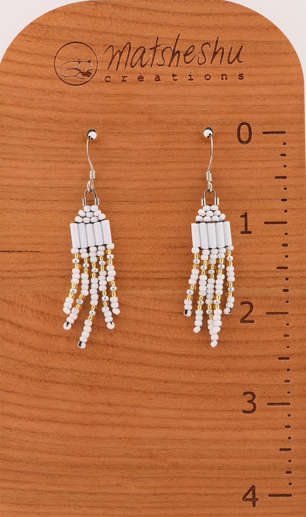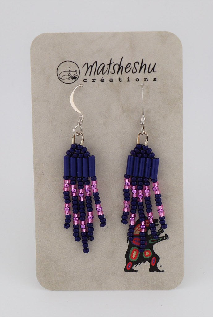 Mini boucles d'oreilles à franges en perles de verres montées sur une attache et crochet en acier inoxydable. Environ 2 pouces de long. Confectionnées avec soin par des artisanes innues de Mashteuiatsh