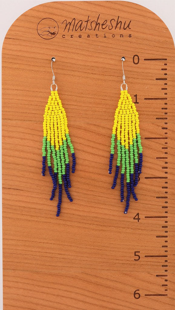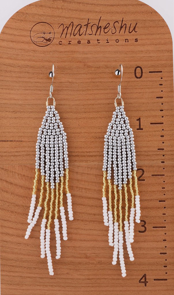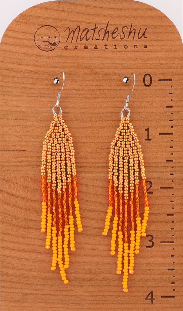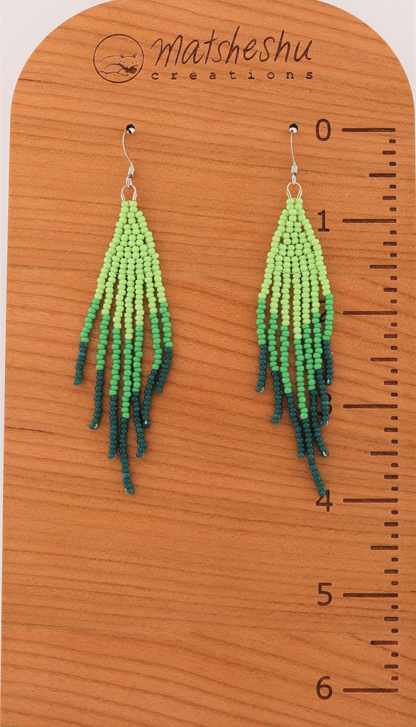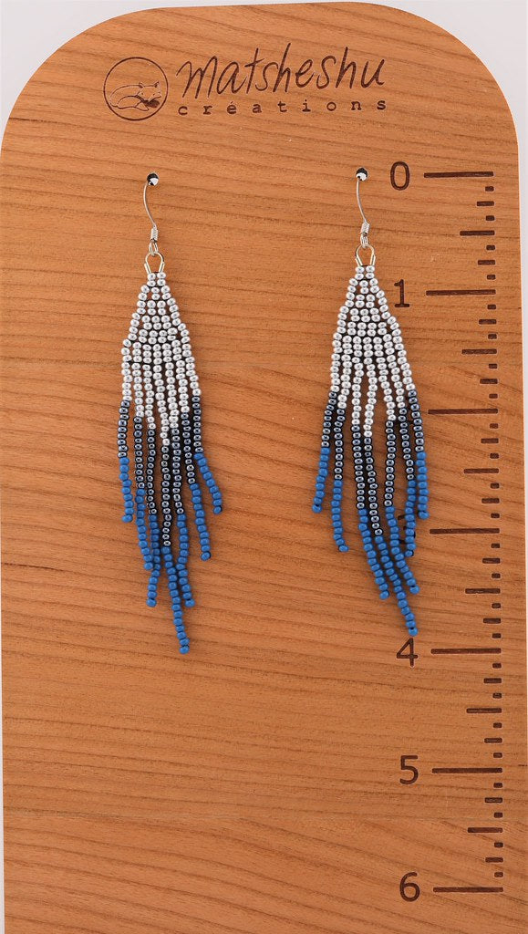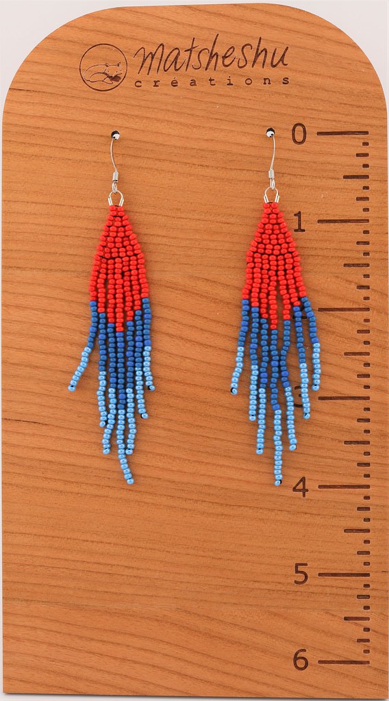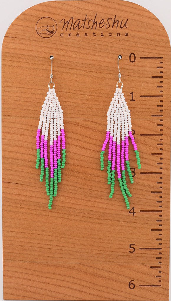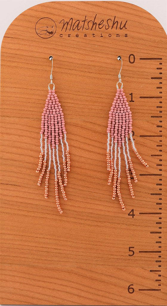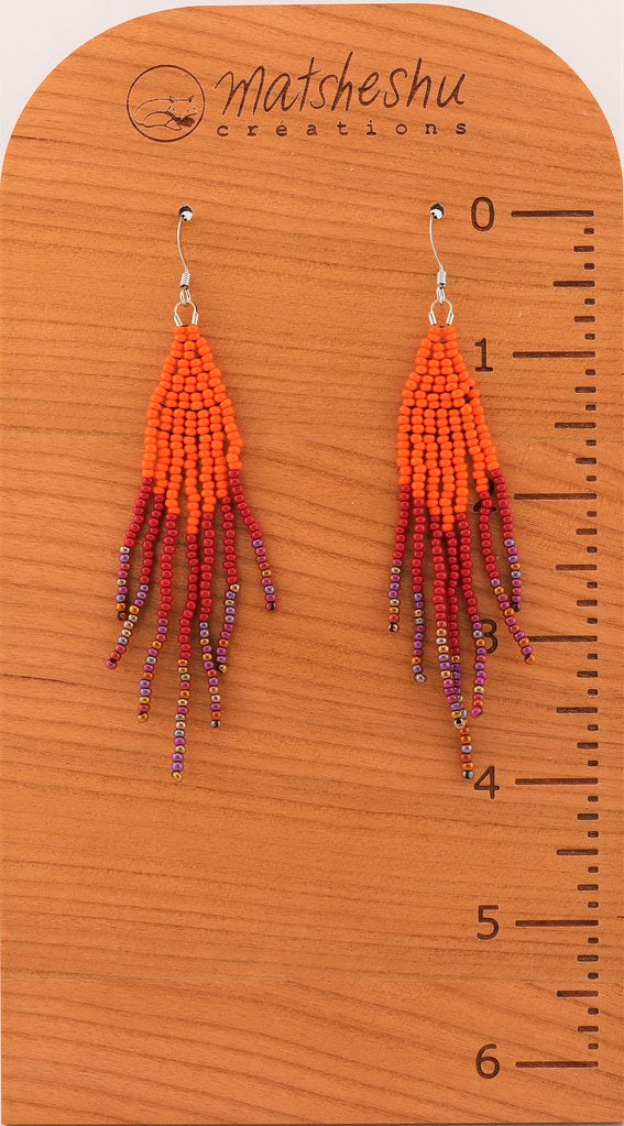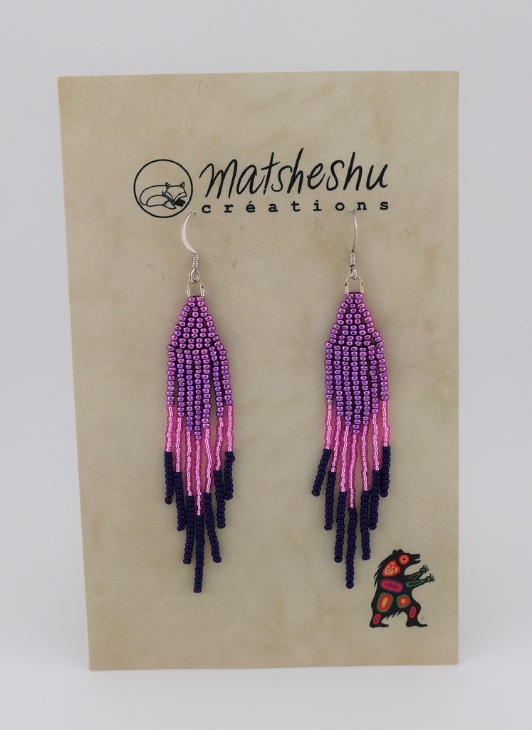 Moyennes boucles d'oreilles à franges en perles de verres montées sur une attache et crochet en acier inoxydable. Environ 4 pouces de long. Confectionnées avec soin par des artisanes innues de Mashteuiatsh