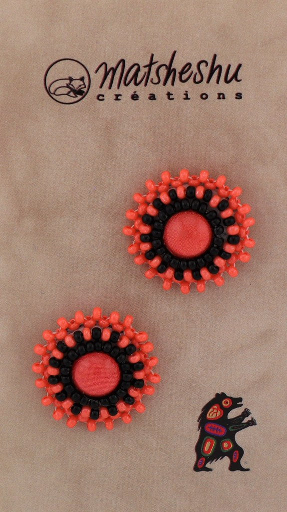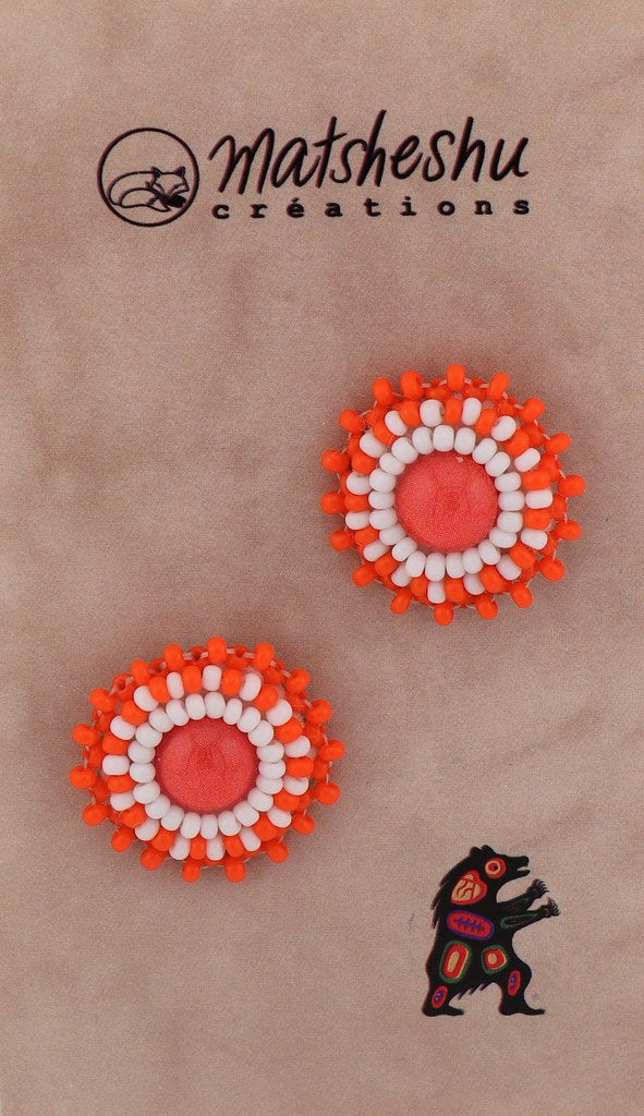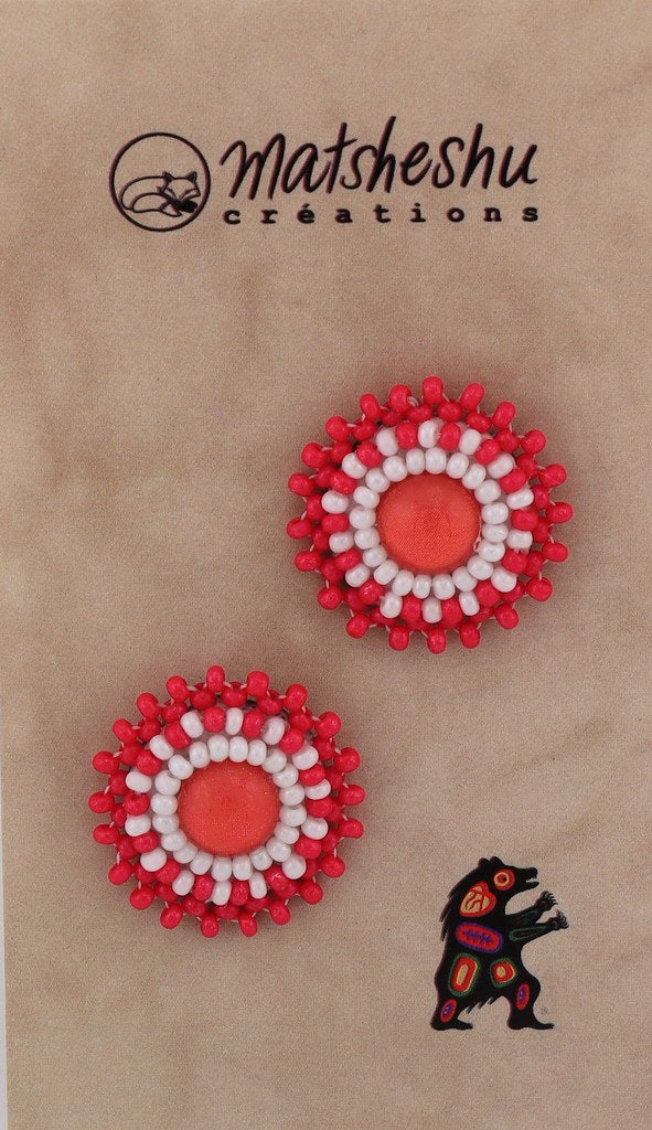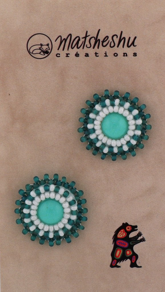 Petites boucles d'oreilles avec un cabochon central en verre 8mm entouré de trois rangées de perles. Modèle léger conçu pour un port confortable. Tige en acier inoxydable. Confectionnées avec soin par Shayna Raphaël-Dominique, innue de Mashteuiatsh.