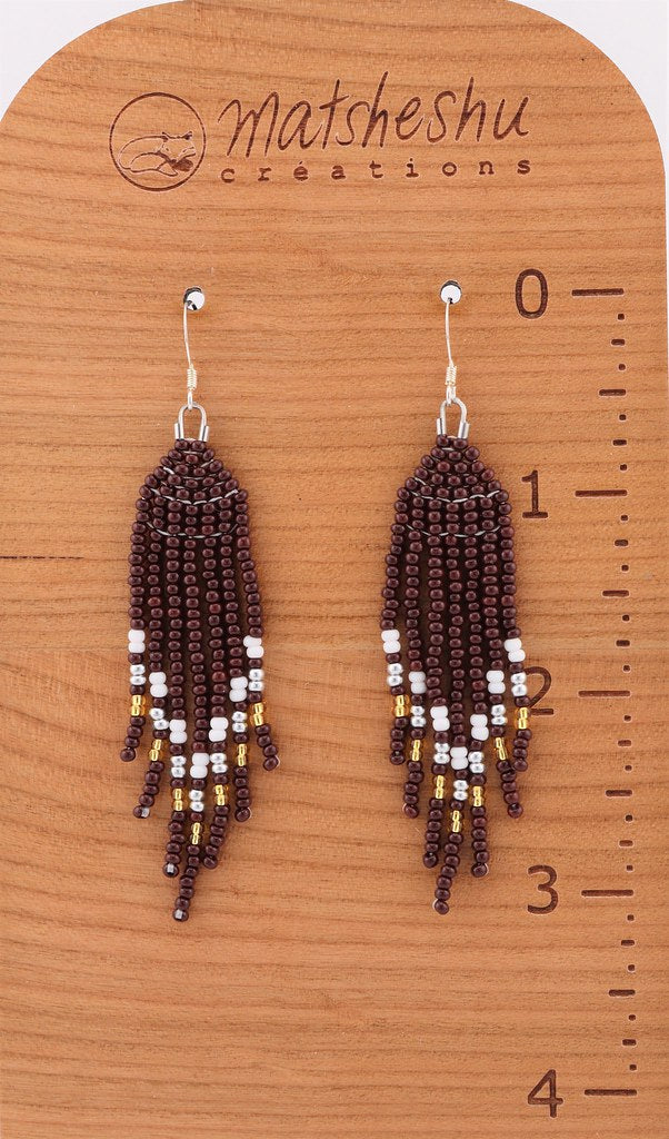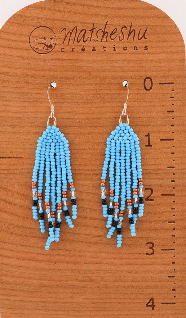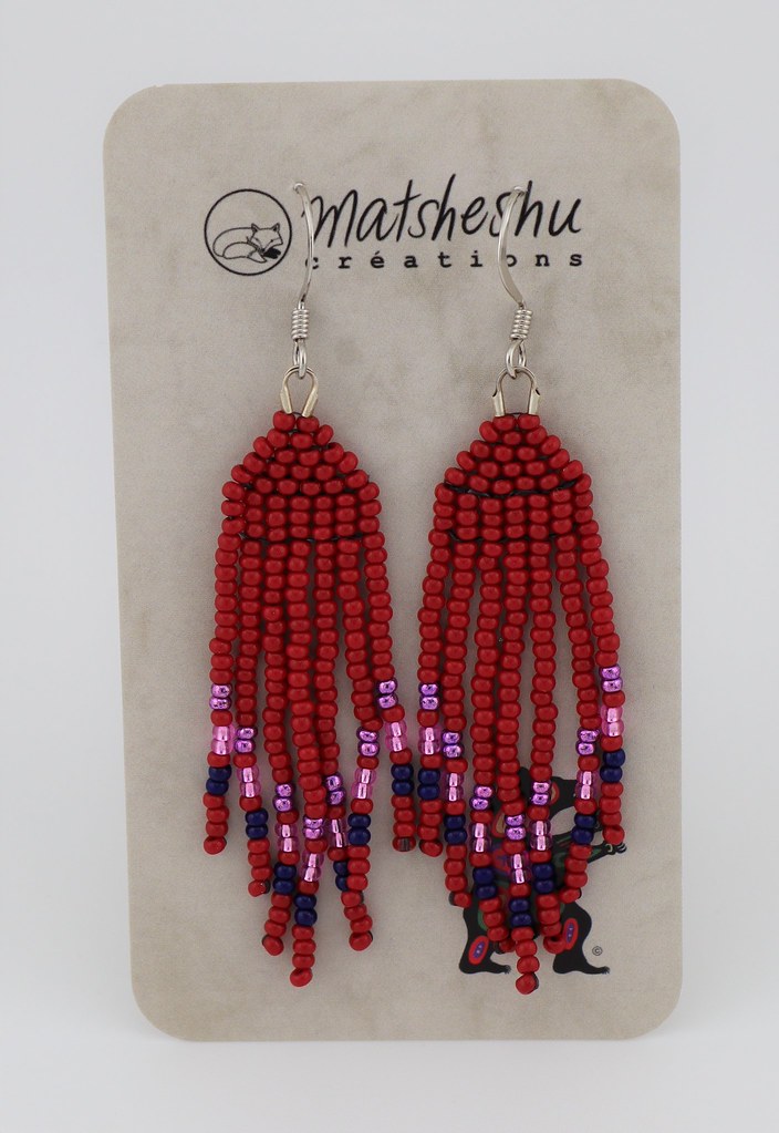 Petites boucles d'oreilles à franges en perles de verres montées sur une attache et crochet en acier inoxydable. Environ 3,5 pouces de long. Confectionnées avec soin par des artisanes innues de Mashteuiatsh