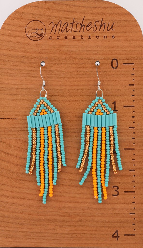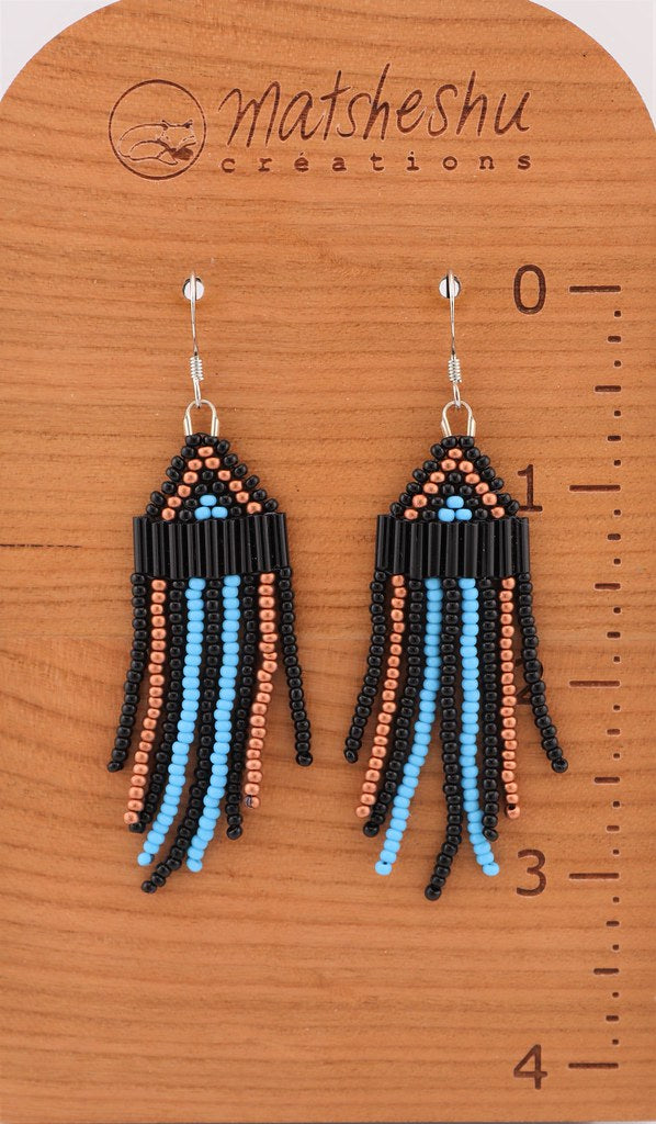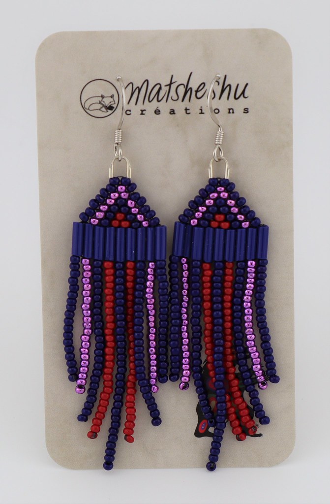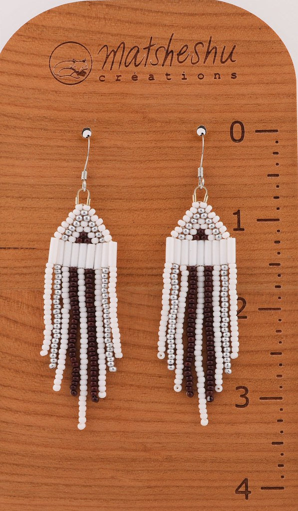 Petites boucles d'oreilles à franges en perles de verres montées sur une attache et crochet en acier inoxydable. Environ 3,5 pouces de long. Confectionnées avec soin par des artisanes innues de Mashteuiatsh
