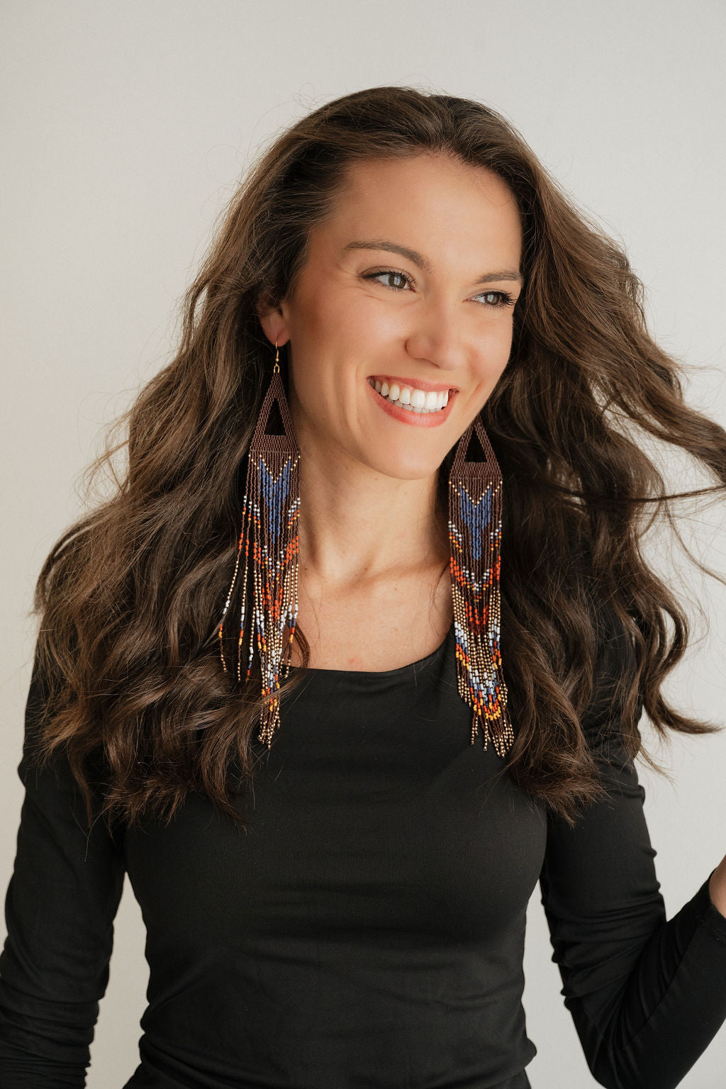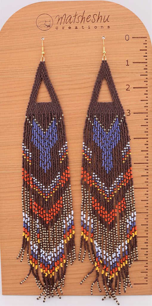 Très grandes boucles d'oreilles à franges en perles de verres miyuki delicas montées sur une attache et crochet en acier inoxydable. Superbe design en brun avec accents de bleu, rouge et jaune. Environ 10,5 pouces de long. Confectionnées avec soin par Anthony Raphaël, innu de Mashteuiatsh.